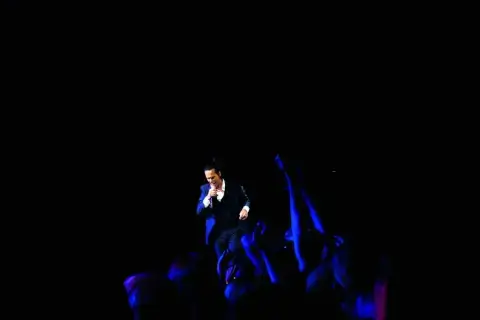Une fois l’artiste arrivé sur scène, son énergie nous explose au visage sans parcimonie. Le set varié, composé de chansons issues des albums Push the sky away, Murder Ballads, Skeleton Tree, The Boatman’s Call, Ghosteen et Carnage, le plus récent en date, fait entrer le public dans une transe communicative et libératrice au bout de quelques secondes à peine. Nick Cave, en prêcheur des temps modernes, n’hésite pas à se mêler à la foule, marchant au-dessus du public sur cette avant-scène installée dans toutes les salles où lui et ses musiciens sont de passage, qui lui offre une proximité et un contact uniques avec ses fans qu’il avoue lui-même chercher à tout prix. Il place une confiance absolue en ce public qu’il sait résolument bienveillant, auquel il tend la main en réponse à des supplications tacites qui font de chaque morceau joué un véritable moment de communion. Ici, il n’hésite pas à lâcher son micro, le confiant à un membre du public qui, bras tendu, fait office d’intermédiaire entre l’artiste et ses milliers de spectateurs. Là, il reproduit à loisir la célèbre scène ornant le plafond de la chapelle Sixtine, frôlant du bout de l’index ceux de la foule aux premiers rangs. Adaptant sa gestuelle aux morceaux interprétés et à l’énergie qui émane des uns et des autres, il offre çà et là une poigne de fer à son public.